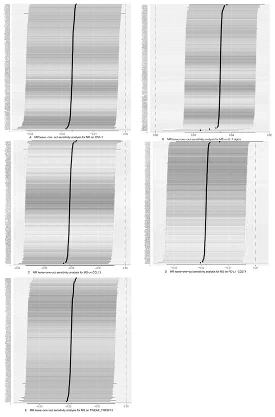 Use of the IVW method to display the results of leave-one-out analyses and assess the impact of individual SNPs on the overall MR results by excluding each SNP in turn. (A) CSF-1 as the outcome, with MS as the exposure; (B) IL-1 alpha as the outcome, with MS as the exposure; (C) CCL13 as the outcome, with MS as the exposure; (D) PD-L1_CD274 as the outcome, with MS as the exposure; (E) TWEAK_TNFSF12 as the outcome, with MS as the exposure.