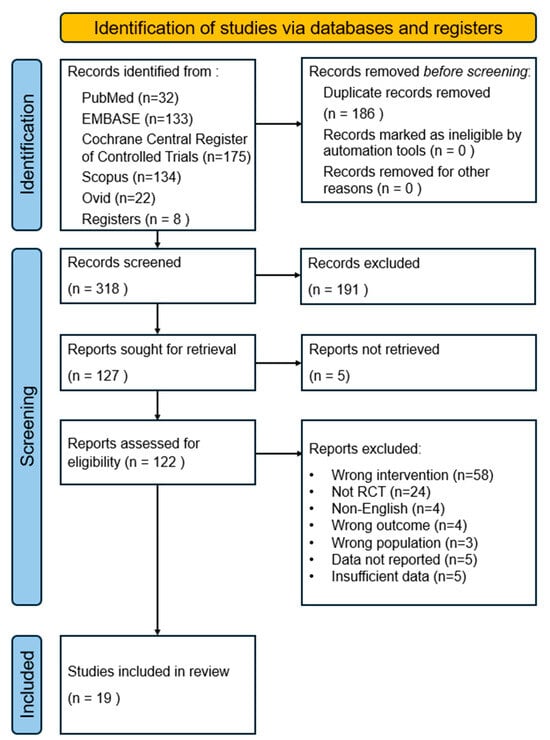 The study selection process is summarized in the PRISMA flowchart. A total of 496 records were identified from electronic searches of five databases. Additional articles were identified through other clinical trials, gray literature, reference lists, and hand-searched journals (n = 8). Duplicate records were manually removed using EndNote software, resulting in the removal of 186 duplicate articles. Subsequently, 318 records were screened by the title and abstract based on the eligibility criteria described earlier, resulting in the exclusion of 191 records. Five studies were not retrieved, and a comprehensive review of the full text of 122 studies excluded 103 of them. The reasons for exclusion were as follows: incorrect intervention (n = 58), non-RCT (n = 24), non-English language (n = 4), wrong outcome (n = 4), wrong population (n = 3), data not reported (n = 5), and insufficient data (n = 5). Finally, 19 articles were selected for inclusion in the meta-analysis. Figure 1 depicts the flowchart.