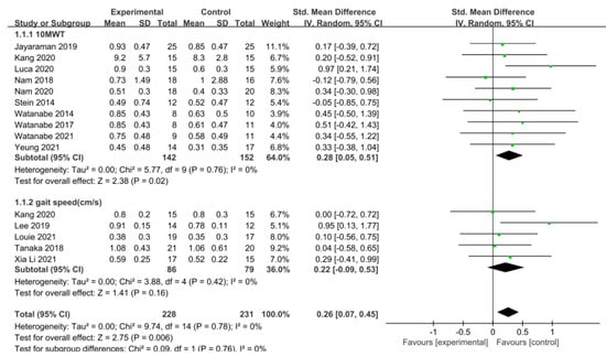 Forest plot of gait speed [,,,,,,,,,,,,,].