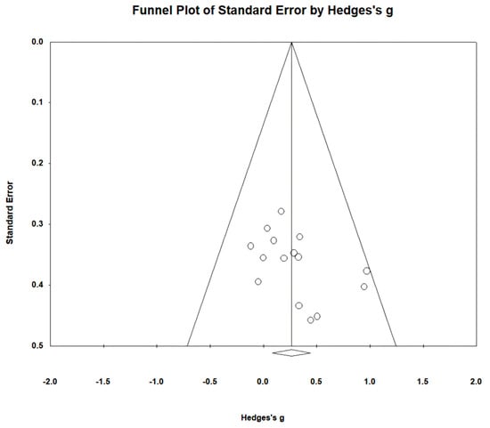 Ten or more studies were pooled for an outcome; thus, visualization of funnel plots was employed to assess small-study effects and publication bias []. Egger’s regression test was performed using CMA software to test for publication bias, with p < 0.05 indicating statistically significant publication bias [].