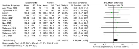 Forest plot of gait endurance [,,,,,,,,,,,].