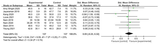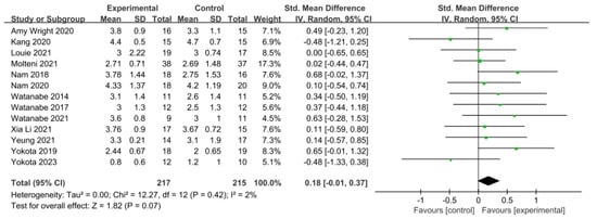 The data analysis for this study was conducted using the Comprehensive Meta-Analysis software (CMA V4). For effect size analysis, the number of subjects, means, and standard deviations for both the experimental and control groups were extracted from each of the included studies. When the results were reported as the median and interquartile range or minimal–maximal range, they were converted to the mean and standard deviation for analysis. Additionally, studies by Yeung [] and Jayaraman [], which reported outcomes as changes, utilized change scores and standard deviations to calculate effect sizes.