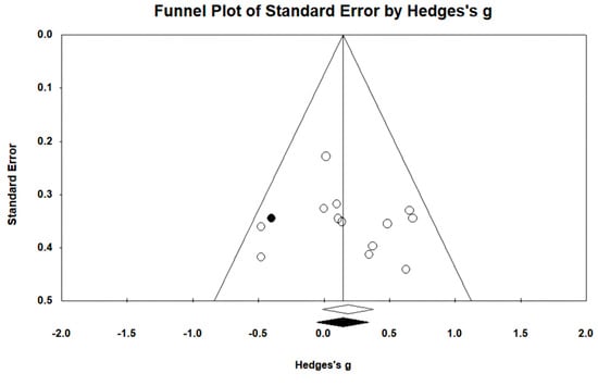 Gait endurance was measured using the 6 min walking test (6MWT) in 12 studies involving 499 participants. The homogeneity test indicated low levels of heterogeneity (Chi2 = 3.74, p-value = 0.98, I2 = 0%), and a random-effects model was employed. In the meta-analysis, a very small effect size of 0.11 (95% CI = −0.07, 0.28) was observed, with no statistical significance. Egger’s regression test was employed to statistically analyze publication bias, revealing the presence of publication bias (p-value = 0.003, 95% CI = 0.68, 2.63). Subsequently, Duval and Tweedie’s trim-and-fill method was applied, resulting in the addition of 6 studies. This led to a shift in the effect size from 0.11 to −0.009 (CI = −0.15, 0.13). The data are shown in Table 6 and depicted in Figure 4 and Figure 5.