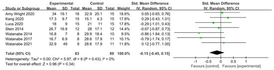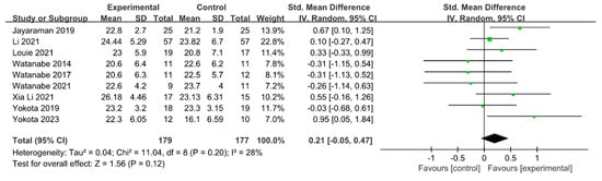 In the studies using the BBS, a low level of heterogeneity was found based on the homogeneity test (Chi2 = 9.09, p-value = 0.25, I2 = 23%), and a random-effects model was therefore used. The effect size was 0.05 (95% CI = −0.23, 0.32), indicating a very small effect size with no statistical significance. Because of the limited number of included studies, statistical tests for publication bias and visual analysis using funnel plots were not conducted.