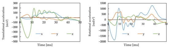 In this case, the mean translational acceleration was 64.6 g for Athlete B and 49.6 g for Athlete C, while the duration was 3.3 ms for Athlete B and 3.7 ms for Athlete C. In addition, the mean rotational acceleration was 1.56 krad/s2 for Athlete B and 1.80 krad/s2 for Athlete C, and 7.6 ms for Athlete B and 7.5 ms for Athlete C.