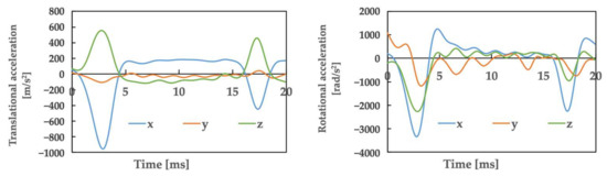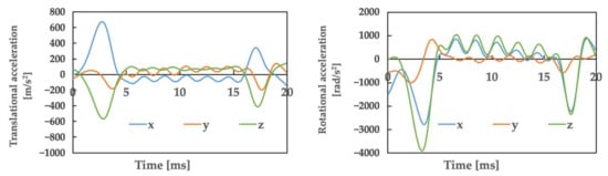 Figure 4 illustrates the movements created based on the video of the accident, as in Case 1. Table 2 presents the posture and initial velocity of the head immediately before the impact of Athletes B and C, while Figure 5 and Figure 6 illustrate the acceleration of the head’s center of gravity. In these figures, the time of the head impact is defined as 0 ms, and the acceleration results represent a duration of 20 ms. The translational acceleration and rotational acceleration just before the impact of the heads of Athletes B and C were calculated from the created movements, and then the initial conditions for the impact analysis were set. Table 3 shows, as obtained by the impact analysis using the model, the maximum values of strain, strain rate, and von Mises stress generated in the skulls of both athletes.