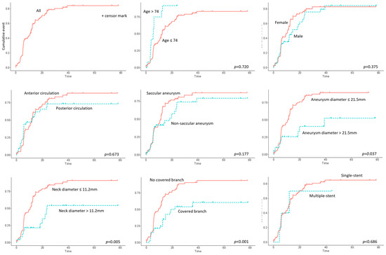 Cumulative event analysis for aneurysm occlusion stratified by various clinical and anatomical factors.