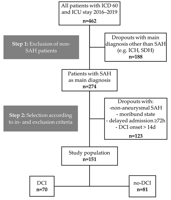 The medical charts of 462 patients admitted to the neurosurgical ICU at the Department of Intensive and Intermediate Care, RWTH Aachen University, Germany, between 2016 and 2019, with a diagnosis of SAH according to the International Classification of Diseases (ICD60), were screened (Figure 2). 151 patients met the inclusion criteria and were included in this study. Of these, 70 patients (46.4%) had DCI (DCI group) and 81 did not (no-DCI group).