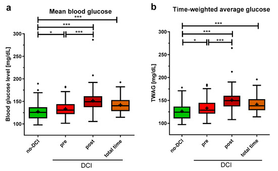 Average blood glucose indices in aSAH patients with and without DCI. (a) For patients without DCI (no-DCI), blood glucose was averaged over 14 days, for DCI patients, this was split up: period before DCI event (pre), after DCI event (post), and the total 14 observation days (total time). (b) Time-weighted average glucose (TWAG) was calculated as the area under the blood glucose curve. Data are presented as median ± 25th to 75th percentiles (box) with Tukey whiskers; data outside the Tukey range are shown as separate dots; mean is shown as +; * p < 0.050, *** p < 0.001.