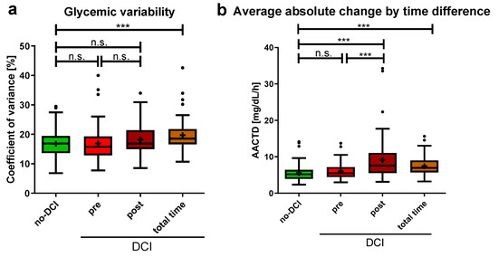 Blood glucose fluctuations in aSAH patients with and without DCI (a) Coefficient of glycemic variation is shown. For no-DCI patients, over 14 days, for DCI patients, split up: pre-DCI, post-DCI, and the total 14 monitoring days. (b) Average absolute change by time difference (AACTD) was calculated as the average absolute change in blood glucose divided by the inter-measurement time. Data are presented as median ± 25th to 75th percentiles (box) with Tukey whiskers, data outside the Tukey range are shown as separate dots; mean is shown as +; n.s., not significant; *** p < 0.001.