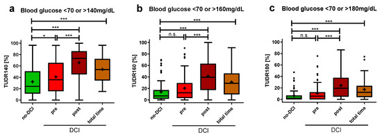 Time-unified dysglycemic rate in aSAH patients with and without DCI. Dysglycemic rates with 6-hourly periods are depicted with hyperglycemic cutoffs of (a) >140 mg/dL (b) >160 mg/dL (c) > 180 mg/dL and hypoglycemic cutoff of <70 mg/dL. All blood glucose values recorded in the ICU for up to 14 days were included. Glycemic values of DCI patients were divided into pre-DCI, post-DCI, and total time. The TUDR was calculated by dividing the dysglycemic by the total number of periods for each patient. The dysglycemic ratio is presented as median ± 25th to 75th percentiles (box) with Tukey whiskers, data outside the Tukey range are shown as separate dots; mean is shown as +; n.s., not significant; * p < 0.050, *** p < 0.001.
