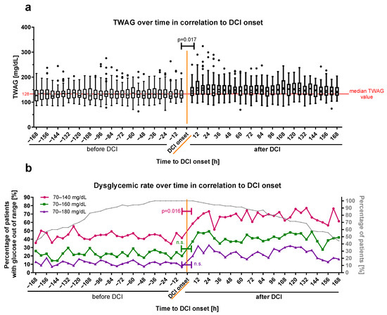 Glucose profile time-series of DCI patients before and after DCI onset. (a) The cumulated TWAG and (b) TUDR for 6-hourly periods of patients suffering from DCI are plotted in relation to its onset (time point zero in orange). Periods before DCI onset were defined as negative and those after the onset as positive. Dysglycemic rates are illustrated with cutoffs <70 mg/dL and >140 mg/dL (pink color), >160 mg/dL (green color), or >180 mg/dL (violet color). The dysglycemic rate for all patients (cumulated) is shown as the percentage of patients with at least one blood glucose measurement out of the glucose target range relative to the total number of patients in the respective period. The evolution of the relative patient number over time is plotted as a percentage of the total number on the right ordinate (b) in gray. The TWAG is shown as median ± 25th to 75th percentiles (box) with Tukey whiskers, data outside the Tukey range are shown as separate dots; mean is shown as dot within the Tukey box; n.s., not significant. The overall TWAG median glucose value pre-DCI (128.7 mg/dL) is shown as a red horizontal line for orientation in (a).