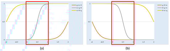As mentioned above, the dendritic neuron model is a feed-forward network and all units are differentiable. Thus, a traditional error backpropagation algorithm can be used to train the neuron by adjusting its synaptic weights , and bias . As shown in Figure 2, due to the constraints of the neural signal range, only the input signal between 0 and 1 is considered. Several scenarios should be evaluated due to the intricate relationship among connection positions and the interplay among and .