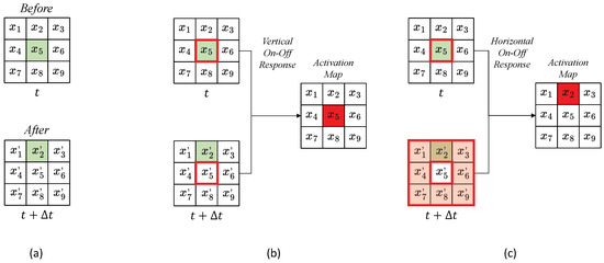 The detection of the direction of motion of an object begins when the retina receives light stimuli from the external environment. The light stimuli include information about the object’s brightness, darkness, and spatiotemporal color changes. The retina captures this information and converts it into electrical signals in the photoreceptor cells. These signals are then transmitted to the bipolar cells, where they are processed based on light intensity. This processing is relayed directly to the ganglion cells via the excitatory vertical pathway. Since ganglion cells also receive inputs from horizontal cells, they indirectly receive signals from surrounding cells. Horizontal cells send inhibitory inputs horizontally in response to the vertical excitatory pathway. Retinal ganglion cells exhibit motion direction selectivity, responding strongly to stimuli moving in a specific direction but not at all to stimuli moving in the opposite direction [8]. On–Off motion direction selective ganglion cells have also been identified. There are On-centered ganglion cells that respond to bright light in the center of their receptive field and Off-centered ganglion cells that respond to dim light in the center. The periphery of the On-centered field responds to dim light, while the periphery of the Off-centered field responds to bright light [35]. Since dendritic shapes are acquired through later training, the connection state must be determined by learning. To address these challenges, we propose an AVS that can detect the direction of object movement for objects of any size, shape, and position in two-dimensional grayscale images. This system passively adjusts the dendrites using the dendritic neuron model, which can acquire motion direction selectivity through learning [36]. Furthermore, to handle grayscale images, we employed an On–Off Response mechanism that incorporates the processing of horizontal and bipolar cells, which includes both horizontal and vertical On–Off Response mechanisms. Both types of On–Off Response mechanisms require a threshold to function effectively. Figure 3a shows a 1-pixel object moving above a receptive field. We designed a receptive field of pixels, representing 9 photoreceptors. The photoreceptors receive stimuli from the image, simulating the process occurring in the retina. The image before movement at time t and the image after moving at time are regarded as the pre-movement and post-movement inputs. We denote the pixels in the pre-movement image as and the pixels in post-movement with . In Figure 3b, the activation map and the corresponding pixels of the vertical On–Off Response mechanism during movement are shown. This mechanism compares the center of the images before and after movement and reacts to changes in brightness, a process occurring in the bipolar cells. The vertical On–Off Response mechanism compares the center pixels, and , with the vertical threshold , using the following equation:
