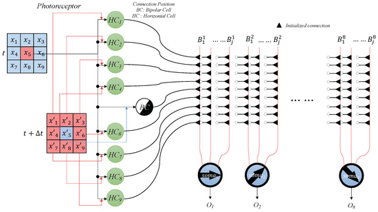 Building bio-inspired neural network models is regarded as a promising approach for solving various computer vision problems, such as orientation detection, object detection, and motion direction [1]. These bio-inspired models are applied in numerous technologies. However, simulating the brain’s complex neural network, which comprises over neurons and more than interactions, presents significant challenges [2]. Approximately 80% of sensory information received by the brain is vision-based, with the retina processing more than half of this visual information [3,4]. The visual data from the outside world, including forms, colors, orientations, and movements, significantly influence human actions and decisions. Among this visual information, the perception of objects and the detection of their movement direction are particularly crucial, as they are directly linked to survival [5]. Therefore, understanding the methods and mechanisms of motion direction detection in vision is a key research theme for elucidating the structure and function of the visual cortex [6]. Research in this area has been ongoing for decades, leading to the proposal of various models aimed at explaining how the brain processes motion direction [7,8]. This research is critical for advancing our understanding of the visual cortex and its role in interpreting and responding to visual stimuli. Hubel and Wiesel implemented a series of experiments on the visual cortex of animals and recorded many significant biological phenomena, contributing greatly to the research of the visual system [9]. They found that some neurons only respond to light stimulation in a specific orientation and are insensitive to the position of the stimuli [10]. The movement of the optimally oriented light stimulation within their receptive fields does not cause neuron inactivation. Bio-inspired models are based on these mechanisms [11]. However, since the specific mechanism of the visual cortex is unclear, most explanations of the visual mechanism so far have been primarily motivated by speculation and non-quantitative methods. Bio-inspired models are based on these mechanisms, even though most explanations of the visual mechanism so far have been primarily motivated by speculation and non-quantitative methods. Based on the results of vision experiments on insects such as flies, Hassenstein and Reichardt proposed a neuron model in 1956 that detects the direction of motion by two spatially different inputs that take into account the time difference [12]. In the same year, the Barlow–Levick model was proposed to explain the results of experiments on rabbit retinal ganglion cells [13]. In 1967, 102 types of direction-selective cells were identified in rabbit retinas [14], and similarly selective cells were found in the retinas of mammals such as humans [15,16]. In 1982, Torre, Poggio, and colleagues proposed a neuron model based on the results of experiments on cat retinal ganglion cells [17]. This model takes into account dendritic processing and has the function of selecting the direction of motion due to the nonlinear interaction of synaptic connections on the dendrites and the time difference of the inputs. This is based on the assumption that the reaction of motion direction selectivity is determined by the synaptic connections on the dendrites [18]. It is also believed that the ability to detect the direction of motion is not innate but is influenced by the external environment after birth instead of before. If sufficient visual stimulation is not provided, visual impairment can result. One example is a study by Blakemore and Cooper in 1970, which revealed that cats exposed only to vertical stimulation after birth did not respond to horizontal stimulation. This suggests that the ability to detect the direction of motion is gradually acquired through exposure to visual stimulation after birth [19].