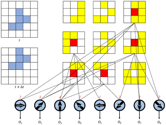 where E is the cross-entropy loss, is the normalized overall output for motion direction detection in a group of input images, and presents the teacher’s signal for the motion direction detection. Given that the AVS architecture for global motion direction detection functions as a feed-forward network, the motion direction detective neurons can be trained using the error backpropagation method. By employing this approach, we endow the system with the ability to learn. The structure of the system is illustrated in Figure 6.