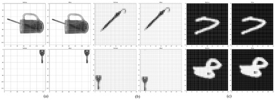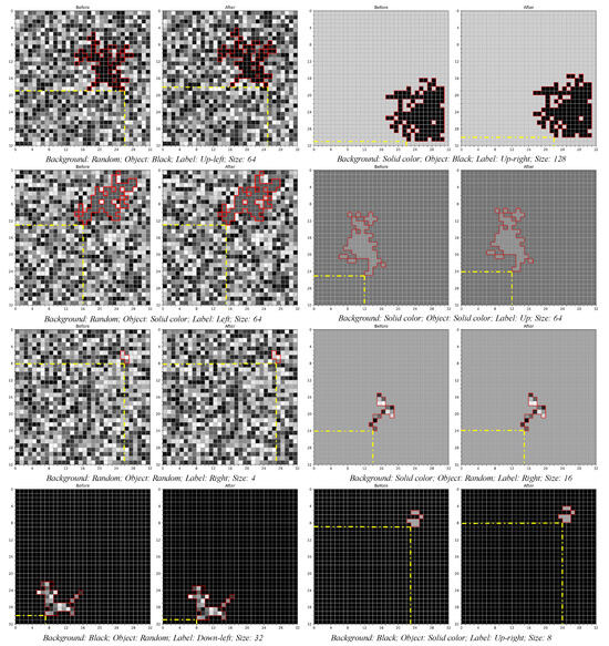 For the real-world dataset, we captured images using an iPhone and converted them to single-channel grayscale images after removing their backgrounds. The images are like the ’Before’ image in Figure 8a. The objects were placed at fixed angles to generate a static dataset of real-world objects. Given that simpler convolutional neural networks (CNNs), such as the Four-Layer CNN and LeNet-5, struggle with varying image sizes, we created a narrowed dataset where these real-world object images were downscaled to pixels, as in the ’Before’ image in Figure 8b. This ensured the preservation of objects’ shape and color features while only reducing image clarity. We then generated a motion direction dataset by moving these downscaled images by one pixel in specified directions and labeling them accordingly, as illustrated in Figure 8a,b.