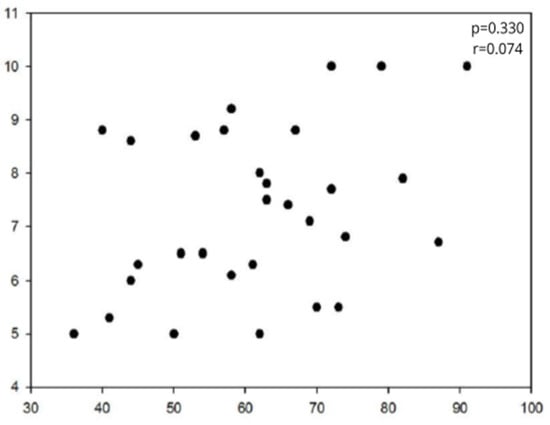 Correlation study between resting motor thresholds in nTMS, with the X-axis representing % of maximum generator activity, and the Y-axis representing threshold in DES (mA). nTMS: navigated transcranial magnetic stimulation; DES: direct electrical stimulation.