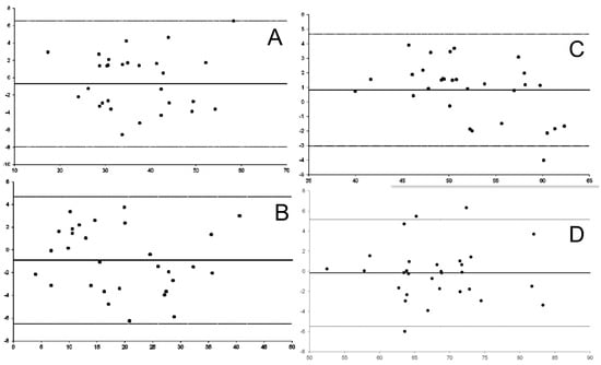 The resting motor thresholds, when comparing the thresholds in magnetic stimulation with those obtained in cortical electrical stimulation, showed no correlation between the threshold values (Figure 1). The analysis of the distribution of vector module differences in the lateralization coordinate showed that in the Bland–Altman distribution, there was a trend toward 0 in the curve that measures the difference between the two methods, with an intraclass correlation tending to 1 (Figure 2A). Figure 2 does not show any trend in the differences between the methods for each coordinate or for the vector module, and the differences are randomly scattered around zero, indicating no systematic error between the methods. It was also observed that the increase in vectorial distance between the methods in the X coordinate is directly correlated with the deviations in the Z coordinate (r = 0.362, p = 0.050) and with the deviation in the vector module (r = 0.621, p < 0.001).