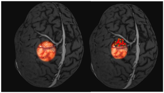 The oncological neurosurgery scope is to understand the anatomical and functional relationships between a brain tumor and the surrounding structures in order to propose a surgical strategy that allows for the maximum possible volume of lesion resection without causing damage to eloquent areas and, consequently, irreversible neurological deficits [,]. One of the major challenges in achieving this goal arises from the mass effect and tumor–brain interactions that trigger central nervous system (CNS) adaptation through neuroplasticity to maintain neurological and cognitive functions []. To address this, techniques for tumor tissue localization and identification have been developed and refined throughout history, with a focus on pre- and intraoperative mapping and monitoring of motor and language function [].