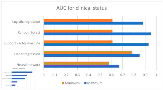 In terms of the main AI models used, the most common approaches were support vector machine, random forest, logistic regression, and linear regression models. Support vector machine achieved an AUC of 0.61–0.93 (poor to outstanding), accuracy values of 50–85.03% (poor to good), and an RMSE of 6.44–10.08. The random forest method achieved an AUC of 0.61–0.95 (poor to outstanding), an accuracy of 49–89% (poor to good), and an RMSE of 7.16–10.5. Logistic regression achieved an AUC 0.61–0.88 (poor to excellent) and accuracy values of 50.3–67% (poor to acceptable). Linear regression achieved an AUC range of 0.78–0.85 (acceptable to excellent), an accuracy value of 67.7–72.1% (acceptable to good), and an RMSE of 6.56–9.70. No specific approach outperformed the other approaches consistently across the studies. For the AUC values, the three highest scores were 0.95 [], 0.93 [], and 0.88 []. Regarding accuracy scores, the three highest scores were 89% [], 85.03% [], and 82.5% []. Figure 2 shows the range of AUCs for the respective algorithms.