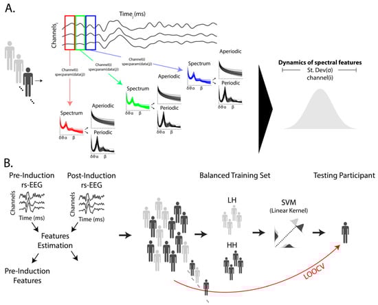 Instead, our previous work shows that the hypnotic induction differentially affects delta-band spectral power and connectivity patterns across delta, theta, alpha, and beta frequency bands between HHSIs and LHSIs. Still, the extent to which these neural patterns facilitate the emergence of hypnotic phenomena and responses remains uncertain and necessitates further corroboration. One limitation of the analyses from our previous work is that we focused on time-averaged values for each neural feature between HHSIs and LHSIs, both outside and inside hypnosis. This approach assumes stationarity and overlooks the dynamics of these neural features—specifically, the degree to which they vary during EEG recordings. The current study addresses this lacuna by examining the variability in spectral features during EEG recordings, comparing how these variations differ between HHSIs and LHSIs both in and out of hypnosis. Specifically, we employed time-resolved spectral decomposition to dissect the rhythmic and arrhythmic components of resting-state EEG activity (Figure 1A, [29]), focusing on the temporal variations of these features. Thus, our methodology centers on the ongoing dynamics of neural patterns as a function of hypnotic susceptibility and hypnotic induction, offering a deeper understanding of the underlying neural mechanisms.