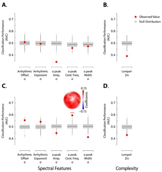 Panels (A,B) show analysis for pre-induction EEG, whereas panels (C,D) show analysis for Δinduction EEG. Panels (A–D) show AUC values for assessing classification performances of SVM linear models for accurately classifying high and low hypnotic-susceptible individuals in LOOVC based on arrhythmic and alpha-band related features of the power spectrum during the EEG pre-induction period (A) and the Δinduction period (C), as well as Lempel–Ziv complexity coefficients calculated during the EEG pre-induction period (B) and for Δinduction (D). Red dots show observed AUC values. Boxplot shows surrogate null distributions based on random permutations where we shuffled the labels during training. The bottom and top whiskers indicate the first and third quartiles, respectively. Three asterisks indicate statistical significance at p < 0.001. Topographies show the averaged coefficient values of the SVM models from all iterations and LOOVC approach for the neural features that can discriminate between high and low hypnotic-susceptible individuals better than chance-level.