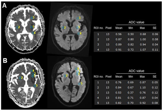 All MRI data were independently reviewed by two experienced radiologists who were blinded to the radiological and clinical outcomes. For quantitative analysis, apparent diffusion coefficient (ADC) maps were automatically calculated using a workstation (SYNAPSE VINCENT Ver.6.7, Fujifilum Co., Tokyo, Japan) (see Supplementary File S2 for representative images). Three regions of interest (ROIs) were selected from the central area of the ischemic lesion (Figures S4 and S5 for subIS, and Figure S6 for no-subIS), and the adjacent white matter in the frontal and temporal opercula and contralateral side (for reference) on the ADC figures according to the DWI and T2WI, with circular-shaped ROIs, were used to compute the average ADC value of the infarcted region (Figure 1).