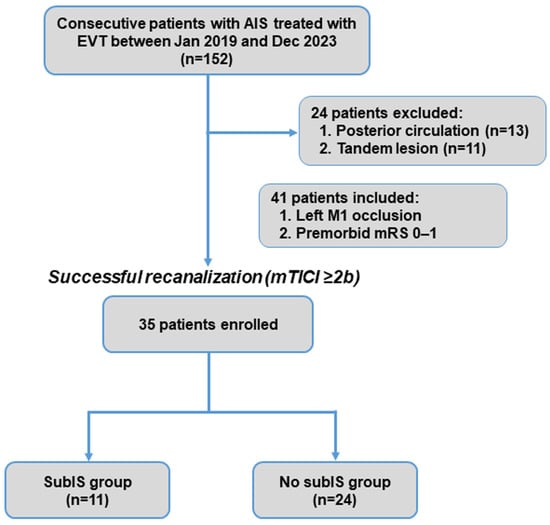 Data were presented as the means ± standard deviations or median with interquartile range if not normally distributed. Categorical variables were described as counts (%) and compared using Fisher’s exact test. Continuous variables with normal and non-normal distributions were compared using the t-test and Mann–Whitney U test, respectively. Multivariate logistic regression analysis was conducted to determine the independent predictors (including subIS and possible risk factors) of post-EVT recanalization after the adjustment of potential confounders (i.e., variables that revealed statistically significant differences between the subIS and non-subIS groups). The ability of substantial parameter(s) to predict the outcome was further determined using receiver operating characteristic curve analysis. A p-value of <0.05 was considered statistically significant. All analyses were performed using Bell Curve for Excel (Ver.4.07; SSRI, Tokyo, Japan), SPSS (Ver.28.0; IBM Corp., Armonk, NY, USA), and Prism version 10 (GraphPad Software, La Jolla, CA, USA).