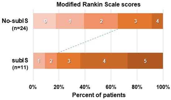 Functional outcome at 3 months in 35 patients with or without subIS, assessed using modified Rankin Scale scores.
