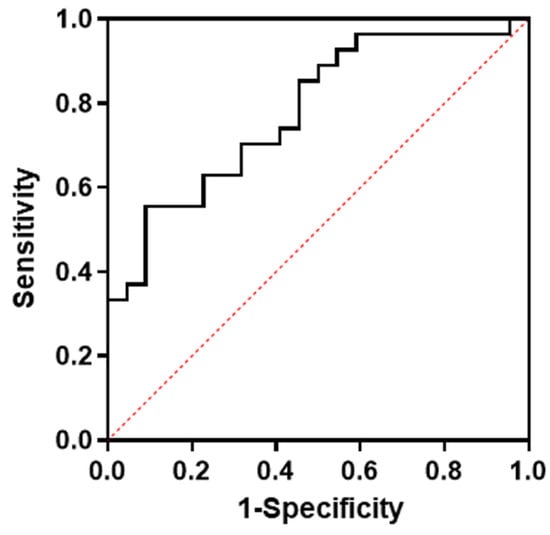 Multivariate regression analysis including factors that may be related to futile recanalization after left M1 occlusion (i.e., age, initial NIHSS, and subIS) demonstrated that subIS was independently associated with unfavorable outcomes (odds ratio: 10.5 [1.53–72.3], p = 0.02) (Table 2). The optimal cut-off value of the ADC value in the subIS group was 0.52 × 10−3 mm2/s with an area under the curve of 0.78, and a sensitivity and specificity of 70% and 64%, respectively, were seen in predicting the 3-month functional outcome (Figure 4).