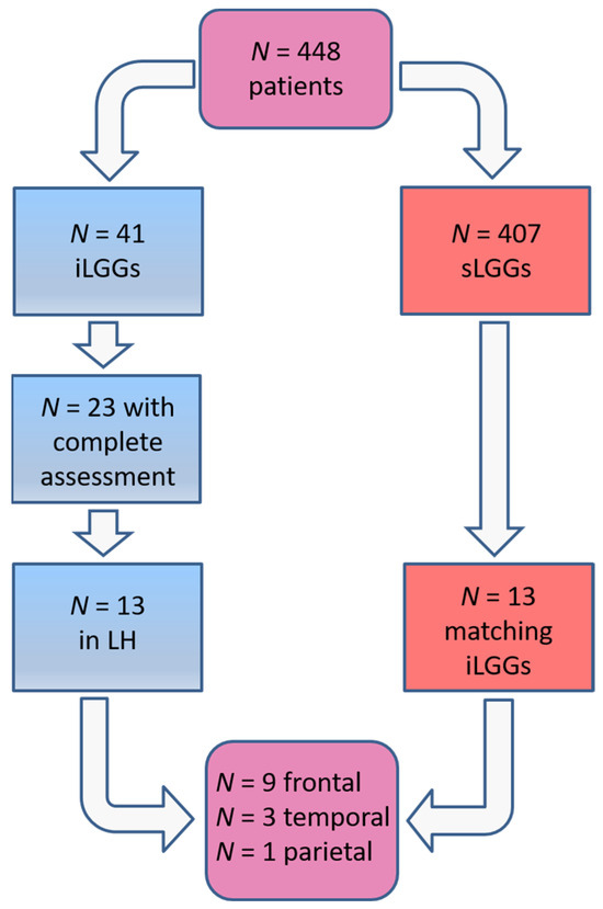 In Cargnelutti et al. [24], we identified, among the whole sample of patients operated on for a glioma since the year 2000, a cohort of 13 patients with iLGG in the left hemisphere and with complete neuroimaging and neuropsychological examinations. No additional patients met these criteria at the time of the current investigation; then, the final sample of patients with iLGG was represented by those same 13 patients in [24]. For the purposes of the current study, we selected 13 patients harboring an sLGG in the left hemisphere in order for them to be matched, as much as possible, with the iLGG group, primarily in terms of lesion volume. To exclude the role of lesion location, we ran the selection in order for the two groups to be also matched in terms of macroanatomical location (i.e., nine frontal, three temporal, and one parietal).