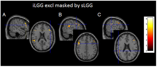Axial projections of the three functional clusters resulting from exclusive (iLGG by sLGG) masking. In (A), left inferior parietal/superior temporal gyri; in (B), left inferior/middle frontal gyri; and in (C), right inferior/middle frontal gyri. Note. Color bar indicates signal intensity.