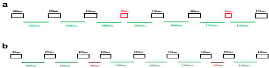 To address the primary aim of examining temporal auditory processing in ASD children, a widely used classical timing paradigm featuring two distinct blocked conditions was designed. In one block, our objective was to assess the amplitude and latency of MMN responses induced by duration deviations, while in the other block, the variations focused on the ISI durations. The specific features of the standard and deviant stimuli in these separate blocks were as follows (see Figure 1). In block 1, the duration of auditory stimulus was considered the target of the task, so frequent stimuli were presented for 100 ms in duration (black rectangles), while deviant stimuli were presented for 50 ms (red rectangles). The ISI in this block did not change and remained fixed (1000 ms) (green lines) (Figure 1a). In block 2, the aim of including this block was to elicit MMN responses by manipulating the ISI. Here, the duration of all stimuli was 100 ms (black rectangles). Nevertheless, the standard ISI (green lines) and the deviant ISI (red lines) were 1000 ms and 500 ms, respectively (Figure 1b).