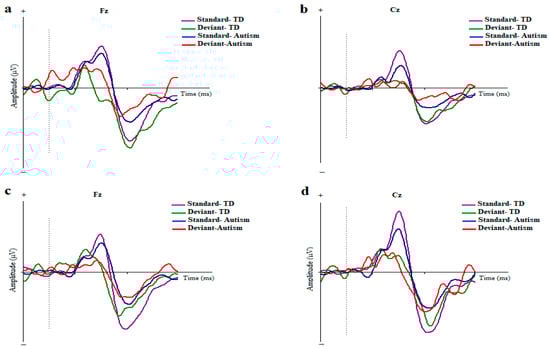 Grand averages of ERP waves to the standard and deviant stimuli in children with autism disorder and TDC at Fz and Cz; Dotted line indicates the start of stimulus (a,b) Duration-based block. (c,d) ISI-based block (MMN, mismatch negativity; Fz, frontal electrode; Cz, central electrode).