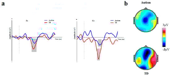 ISI-based block. (a) Grand averages of mismatch negativity event-related potentials in children with autism disorder and TDC at Fz and Cz; Dotted line indicates the start of stimulus and grey area represents MMN peak. (b) The scalp topographical map for MMN. The top topography corresponds to the autism group, while the bottom one is for the non-autism group (MMN, mismatch negativity; Fz, frontal electrode; Cz, central electrode).