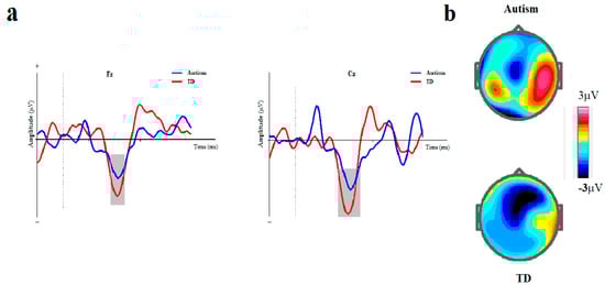 MMN amplitude changes in response to duration changes of auditory stimuli have been reported in previous oddball paradigms [68,69]. Neurophysiological reports demonstrated that children with ASD exhibited reduced MMN amplitudes in response to differences in tone duration and alterations in vowel duration [30,42]. Additionally, they display diminished MMN responses to subtle temporal indicators like formant transition duration [70]. The decreased MMN amplitude in ASD children might reflect the differential processing of the two different deviant stimuli in our groups. A reduced MMN amplitude in children with ASD suggests that their automatic orienting reflex to deviations is less precise when compared to TD children, a finding that aligns with previous reports [71,72]. Reduced MMN amplitudes could demonstrate a relative hyposensitivity to auditory stimuli in our ASD participants. This is consistent with the suggestion that individuals with ASD may typically exhibit more of a tendency towards sensory stimuli hypo-responsiveness rather than hyper-responsiveness [48,49,73]. From a neural perspective, hyper-responsiveness and hypo-responsiveness are terms used to describe elevated or reduced neural firing, respectively [4].