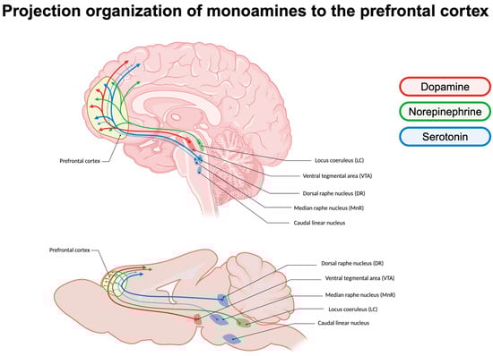 The term “monoamines” refers to a group of neurotransmitters characterized by an amino group linked to an aromatic ring via a two-carbon chain [23]. The PFC in both the human and rodent brain is innervated by projections from monoaminergic nuclei originating in the brainstem, including the dorsal and median raphe nuclei, locus coeruleus, and ventral tegmental area (Figure 1) [19]. Monoaminergic systems are critical components for maintaining various higher cognitive processes, including arousal, working memory, and emotional responses [23]. Due to their notable role in these higher order PFC functions, it is not surprising that many monoamine receptors are the pharmacologic targets for several psychiatric disorders, including depression, schizophrenia, and anxiety [19,24]. The tight-knit relationship between monoamines and the prefrontal cortex is critical for crucial higher cognitive functions. Three major monoamines, dopamine, serotonin, and norepinephrine, exert profound influences on PFC cognitive function through their interactions with specific receptors distributed throughout this brain region.