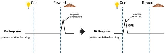 Mounting evidence underscores the pivotal role of dopamine in learning and motivational control, particularly in associative learning and memory processes. As previously mentioned, dopaminergic projections to the PFC display distinct firing patterns: tonic and phasic firing. Dopaminergic phasic burst activity has been associated with the attribution of incentive salience to reward cues during associative learning. These associative circuits modulated by dopamine are sensitive to the relative timing and order of events, both of which are necessary to accurately predict rewarding or punishing reinforcement [78]. It is important to note that phasic dopamine transients, while critical for associative learning, do not themselves represent valence. Rather, they are crucial for the recognition of behaviorally relevant events throughout learning [79]. For example, when presented with a cue followed by an appetitive stimulus, dopaminergic neurons respond with short, phasic bursts [58]. Once animals successfully associate an unconditioned stimulus (cue) with a reward, phasic burst activation shifts from the time the appetitive stimuli is presented to the time of the cue [80]. These phasic changes in dopamine are hypothesized to encode the reward prediction error (RPE), or the difference between an expected reward following an action and the actual reward received (Figure 2) [81,82,83]. The RPE is an essential feature of reinforcement learning, allowing for one’s behavior to adapt to changing environments [81].