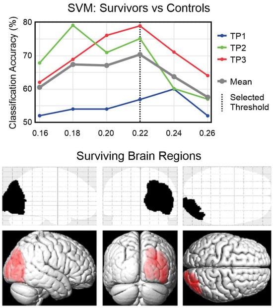A region-based feature selection process was used, wherein the voxel-wise BOLD difference “Letter > Color” was spatially averaged into region-wise BOLD difference “Letter > Color” based on the Neuromorphometrics atlas [] (https://www.neuromorphometrics.com/, accessed on 3 September 2024). For each visit independently, the regional-wise BOLD difference “Letter > Color” of each subject underwent a feature selection filter utilizing the Fisher score [,] to estimate signal differences between medulloblastoma survivors and control volunteers in each brain region. Brain regions that met or exceeded these thresholds at least once across the three visits were selected. At the outset, Fisher score thresholds ranging from 0.16 to 0.26 (maximum threshold with selected brain regions), with increments of 0.02, were considered. Subsequently, the optimal threshold (0.22) was determined based on the highest average SVM accuracy (across the 3 visits).