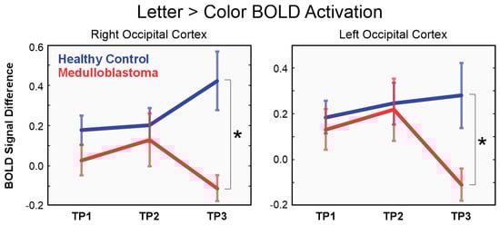 BOLD difference “Letter > Color” cluster averaged and grouped by participant group (medulloblastoma survivors depicted in red; controls in blue) for visits TP1, TP2, and TP3. The stars * indicate significant differences (right occipital cortex: p = 1.8 × 10−3; left occipital cortex: p = 1.9 × 10−2) between medulloblastoma survivors and controls, observed exclusively in TP3. (Left Graph): Single cluster on right occipital cortex that survived the optimal threshold. (Right Graph): Contralateral homolog cluster on the left occipital cortex.