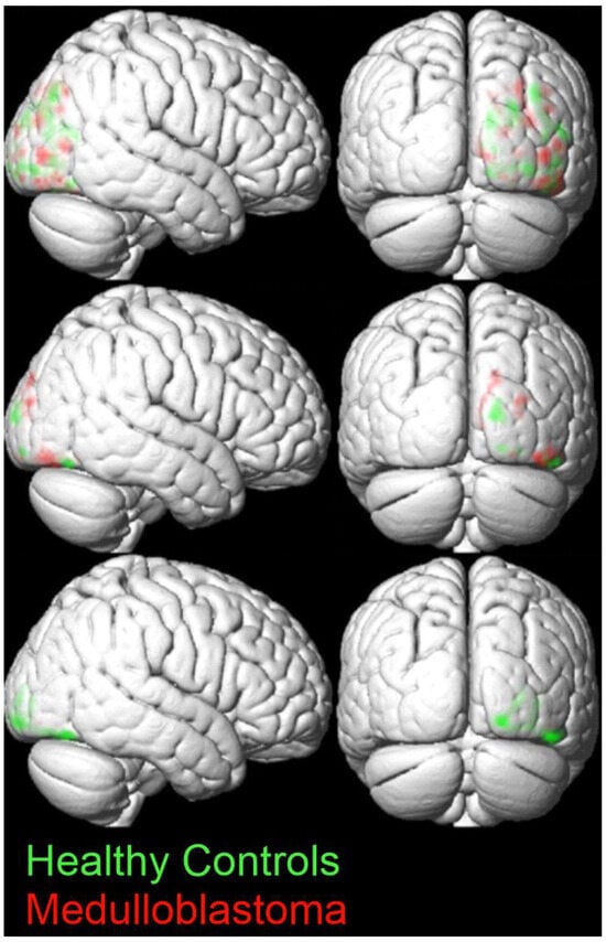Medulloblastoma is the most common malignant brain tumor in children, accounting for approximately 20% of all pediatric brain tumors []. It predominantly affects the pediatric population, with a 10-fold higher frequency than in adults [], particularly in children between the ages of 2 and 8 years []. Medulloblastoma primarily arises in the cerebellum or posterior brainstem located within the posterior fossa []. The cerebellum is known to interact with supratentorial somatomotor circuits to coordinate movement, and increasing evidence suggests it also plays a role in coordinating cognitive processes with the cerebrum [,]. Clinically, medulloblastoma often presents with symptoms related to increased intracranial pressure, such as headaches, nausea, vomiting, and balance difficulties, due to its location in the posterior fossa []. In younger children, irritability and developmental delay may also be observed. Treatment for medulloblastoma includes maximal surgical resection, radiation therapy, and adjuvant chemotherapy [,], each of which can compromise brain integrity and function. Recent advancements in treatment have significantly improved survival rates, making the long-term consequences of cancer and cancer treatment on cognitive functioning an increasing concern [,].