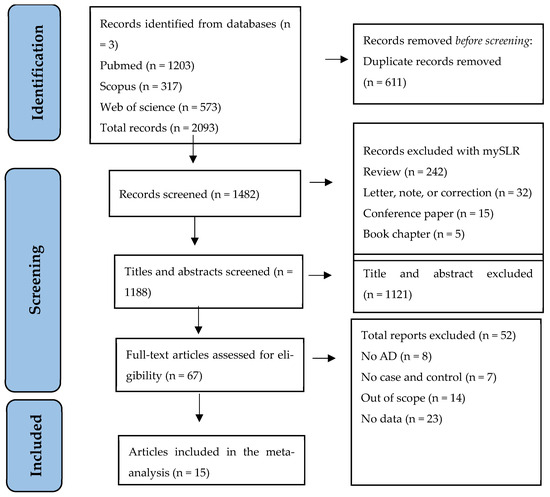 In total, 2093 records were identified from the initial literature search of the three databases (PubMed, Scopus, and Web of Science). After excluding duplicate records, 1482 items remained. MySLR removed 294 papers because they were review-based or non-original research. Of the 1188 studies remaining, 1121 were discarded based on their abstracts. After full-text reading and analysis, 52 records were excluded for failing to meet the inclusion/exclusion criteria. Therefore, a total number of 15 studies were considered eligible. The PRISMA flowchart in Figure 1 shows the selection of the studies for this systematic review.