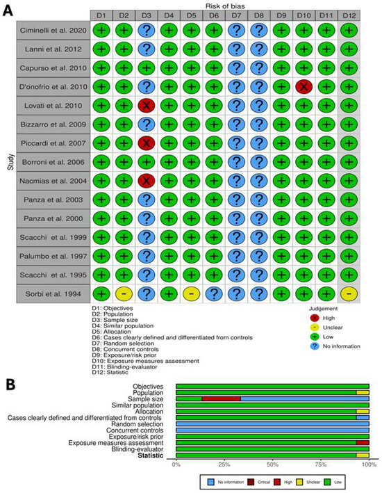 The inclusion criteria for studies published up to 15 November 2023 were as follows: population: Italian population with AD; exposure: APOE; outcomes: present or absent allele and genotype; and types of study: case–control studies conducted on an Italian population.