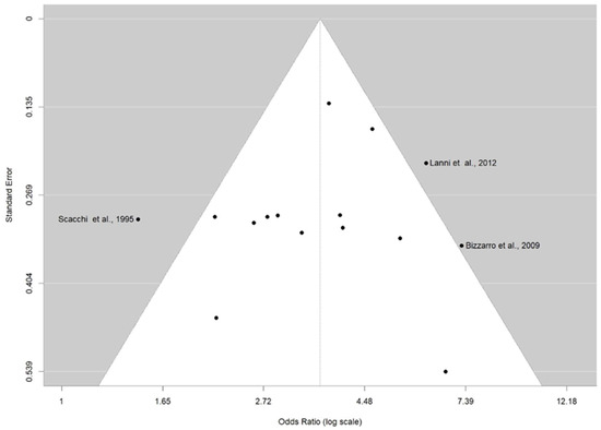 When stratified by location (southern, northern, and center), we used only 14 articles due to Sorbi et al. not reporting an allocation study [42]. APOE ε4 allele carriers significantly had a higher OR in northern Italy (OR 4.22; 95% CI [3.46–5.16], p < 0.0001) compared to southern and center Italy (OR 3.02; 95% CI [2.28–4.01], p < 0.0001 and OR 3.97; 95% CI [1.37–11.56], p < 0.0001, respectively). A forest plot of the subgroup analyses by location is displayed in Figure 9.