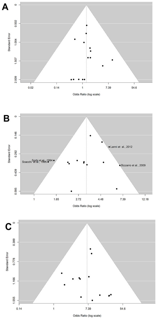 Funnel plot on the association between genotype carriers ε4 and AD risk. (A) Genotype ε2/ε4. (B) Genotype ε3/ε4. (C) Genotype ε4/ε4. The x-axis displays the estimated effect size as the OR (log scale), and the y-axis represents a measure of study precision as the standard error. The horizontal line in the figure represents the overall estimated effects as the odds ratio (log scale). The two diagonal lines represent the 95% confidence limits of the effect estimate.