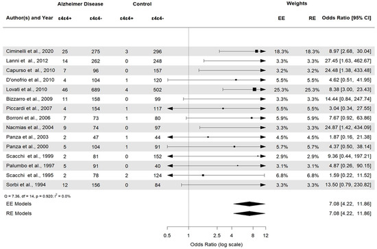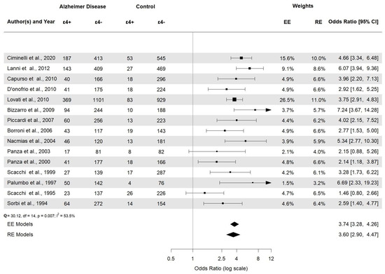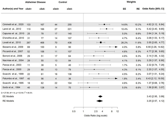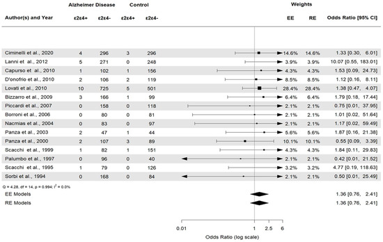 Alzheimer’s disease (AD) is a progressive neurodegenerative disorder and the most common cause of dementia, accounting for 60–80% of cases in elderly individuals [1]. Memory impairment, cognitive decline, and behavioral changes are most often associated with the disease [2,3], although less common clinical presentations are becoming more recognized. The core of AD neuropathology consists of extracellular beta-amyloid plaque deposits in discrete brain areas and intracellular neurofibrillary tangles (NFTs) composed of aggregated tau protein. Additional factors in the pathogenic framework of AD include the presence of neuroinflammatory conditions and vascular dysfunction [4]. Despite extensive research efforts, the etiology of AD remains poorly understood. Studies on familial forms of early-onset AD (EOAD) happening before 65 years of age have highlighted the crucial role of precise mutations in the amyloid precursor protein (APP), presenilin 1 (PSEN1), and presenilin 2 (PSEN2) genes; however, these rare familial forms of AD account for less than 1% of the cases [5]. More than 95% of AD cases are sporadic or late-onset AD (LOAD), where both environmental and genetic factors play a significant role in its etiology. The APOE gene has been identified as the most potent genetic risk factor in sporadic disease [6]. Located on chromosome 19q13.32, the APOE gene encodes a protein primarily involved in lipid metabolism and transport in the central nervous system [7,8]. Three allelic variants of the gene, namely ε2 (APOE2), ε3 (APOE3), and ε4 (APOE4), have a worldwide frequency of 8.4%, 77.9%, and 13.7%, respectively, and six genotypes (ε2ε2, ε2ε3, ε2ε4, ε3ε3, ε3ε4 and ε4ε4) [9] have been identified in humans. Meta-analyses have shown that the APOE ε4 allele increases the risk of the disease by three times in heterozygotes and by about 15 times in homozygotes [9]. In contrast, the APOE ε2 allele reduces AD risk by almost half, relative to the common APOE ε3 allele [10,11]. Significantly, the APOE ε4 both increases the risk of AD and lowers the age of disease onset in an allele number-dependent manner [12]. The precise molecular mechanism by which the APOE polymorphism determines the risk of AD remains unclear. Evidence advises that human APOE isoforms significantly impact AD pathogenesis through their differential effects on Aβ aggregation and clearance. However, APOE isoforms also affect multiple pathways that are not necessarily dependent on Aβ, with APOE4 revealing either a gain in toxic function or a loss of physiological function [13]. Although the APOE ε4 allele accounts for most of the genetic risk in sporadic AD [14], the contribution of other genes cannot be ruled out. Thanks to GWAS, dozens of genes robustly associated with AD have been recently discovered [15,16]. The heterogenic pathogenetic profile and the multifactorial nature of sporadic AD in which several susceptibility genes act in a complex interplay with environmental factors, might explain this difficulty [17]. Even if several questions are still open on the etiology of AD, the impact of genetic variants represents a key factor in the pathogenetic framework of the disease, as highlighted by several studies in the field. Herein, we conducted a meta-analysis to systematically assess the results of various research on the association among the APOE allele, genotypes, and AD risk for the first time in Italian population.