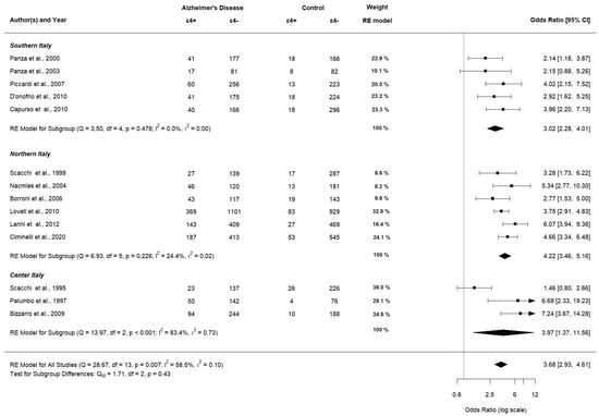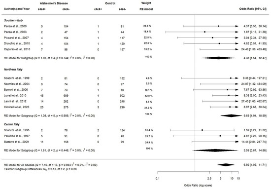 Figure 10 shows the corresponding results for APOE ε4ε4 genotype carriers significantly having a higher OR in northern Italy (OR 9.69; 95% CI [4.94–18.99], p < 0.0001) compared to southern and center Italy (OR 4.38; 95% CI [1.54–12.47], p < 0.0001 and OR 3.59; 95% CI [0.87–14.86], p < 0.0001, respectively).
