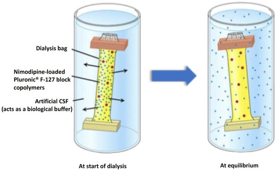 The in vitro drug release profile of nimodipine from the Pluronic® F 127 copolymers in artificial CSF was evaluated using the dialysis bag method (Figure 1). For this purpose, the dialysis bags (Spectrum™ Labs Spectra/Por™ 6 3500 D MWCO, Fisher Sientific, Schwarte, Germany) were first soaked in deionized water for 24 h and stored in a cool place at 4 °C until use. For experimental conversion, 10 mL of the nimodipine-loaded micellar solution was added to the dialysis bag. The respective ends of the bags were clamped as intended and placed in 200 mL artificial CSF solution. The whole set-up was stirred at 36.5 °C for 72 h at 100 rpm. At predetermined time points (0, 5, 15 and 30 min and 2, 4, 24, 48 and 72 h) an aliquot of 300 µL was taken from the dissolution medium.