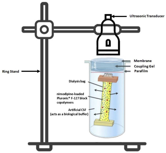 The in vitro experimental setup included three steps: 1—preparation of Pluronic® F-127 (BASF Corporation, Florham Park, Morris, NJ, USA) block copolymers loaded with nimodipine, 2—measurement of the spontaneous continuous release of nimodipine from the Pluronic® F-127 block copolymers, and 3—measurement of the ultrasound-induced release of nimodipine from the Pluronic® F-127 block copolymers after singular and repeated sonication. Pluronic® F-127 block copolymers were used as nanocarriers without further purification. Pluronic® F-127 is a triblock copolymer of polyethylene oxide and polypropylene oxide (PEO-PPO-PEO) with a molecular weight of 12,600 Da and a hydrophilic–lipophilic balance (HLB) of 22 (all data from the manufacturer).